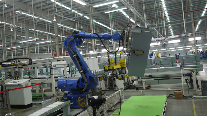 3、壓縮機自動化組裝。冰箱發(fā)泡后豎身45度、由機械手固定安裝壓縮機的工裝設備,目前已投入實際應用。機器人識別、搬取、固定壓縮機的裝備技術,改變了原先操作工身兼搬運工、甚至焊接工的情況,明顯降低了現(xiàn)場工人的勞動強度,成為冰箱生產自動化的重要環(huán)節(jié)之一。
