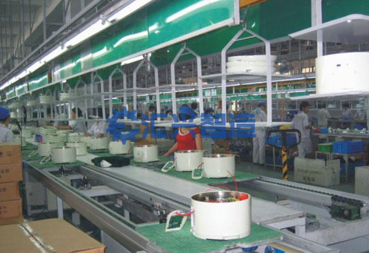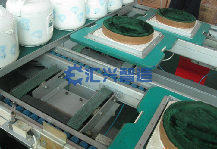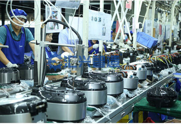 匯興智造電飯煲整廠自動化生產(chǎn)線是由各式差速鏈裝配檢測線、懸掛輸送裝配線、輥道輸送裝配線、鏈板式電機(jī)浸漆線、電飯煲測試檢測線組成,另外包括自動噴涂設(shè)備、頂升平移機(jī)、打包機(jī)等各類專機(jī)設(shè)備,共同完成電飯煲的生產(chǎn)任務(wù)。