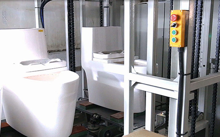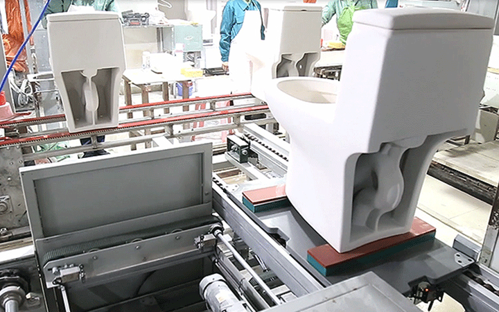 馬桶整廠自動化生產(chǎn)線是由坯體自動輸送干燥存儲、機器人打磨修坯、機器人噴釉、組裝、測試、成品包裝等階段組成,此自動化生產(chǎn)線提高了工作環(huán)境性與潔凈度,降低員工的工作疲勞度,為員工從簡單勞動向智力勞動的轉(zhuǎn)移,終實現(xiàn)馬桶整廠自動化生產(chǎn)。