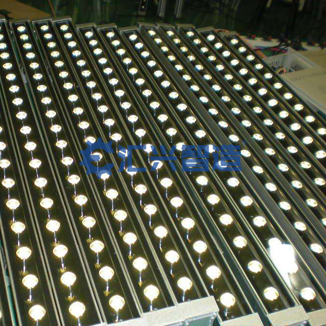 整燈裝配線主要是由輸送帶上料組裝和裝配機(jī)完成剪線、彎線、上鋁鉚釘、功率檢測(cè)、壓針、點(diǎn)膠、扣泡殼等工序,全線只需操作工人2名,半成品上料1名,可替代手工組裝6人的同等產(chǎn)能,工藝品質(zhì)穩(wěn)定。整線造價(jià)經(jīng)濟(jì)適用占地空間小,針對(duì)小批量的產(chǎn)品可選擇性使用部分自動(dòng)化功能,整線留有自動(dòng)化端口后續(xù)可升級(jí)如自動(dòng)連接老化線。