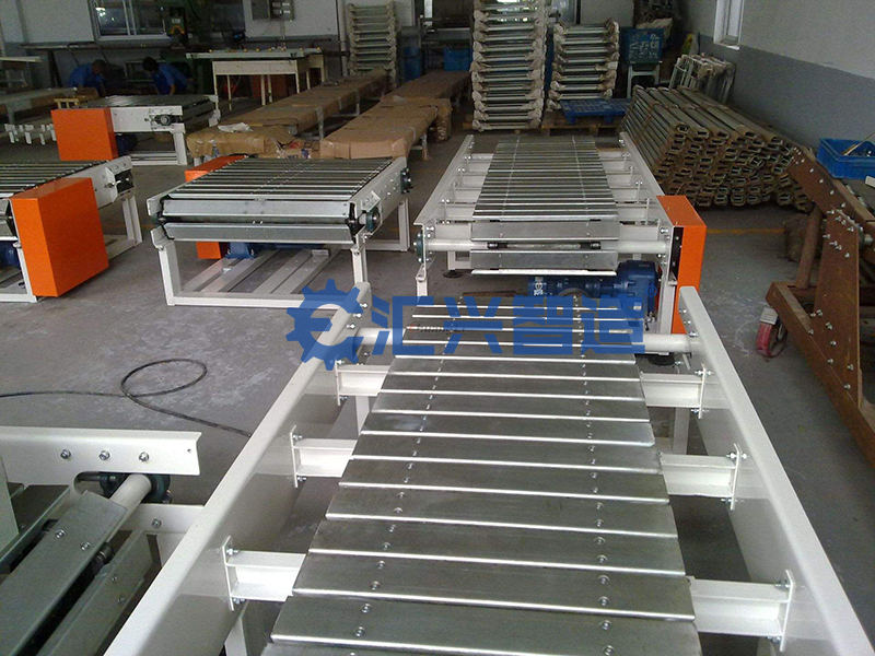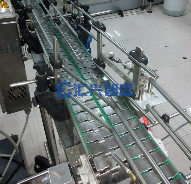 鏈板輸送線以標準鏈板為承載面,由馬達減速機為動力傳動;我們可以通過多列鏈板并行,使鏈板輸送線做的很寬并形成差速,利用多列鏈板的速度差使多列輸送在無擠壓的情況下變?yōu)閱瘟休斔?,從而滿足飲料貼標、灌裝、清洗等設備的單列輸送的要求,同樣也可以使單列變成多列并行走緩慢,從而產(chǎn)生儲存量,滿足殺菌機、儲瓶臺、冷瓶機的大量供料的要求,我們可以將兩條鏈板輸送線的頭尾部做成重疊式的混合鏈使得瓶(罐)體處于動態(tài)過度狀態(tài),使輸送線上不滯留物料,可以滿足空瓶以及實瓶壓力和無壓力輸送。