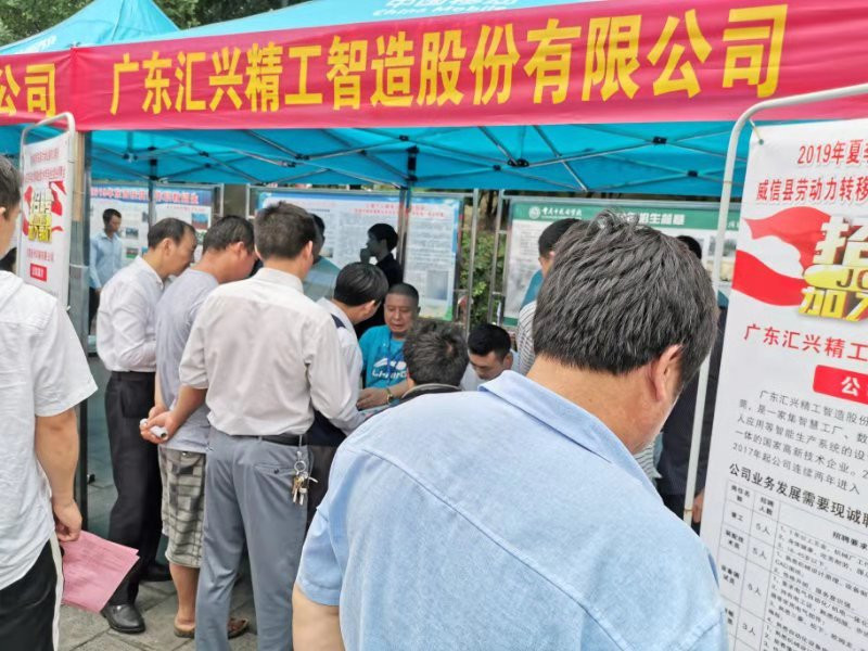 由威信縣委、縣政府,東莞市大嶺山鎮(zhèn)黨委、政府主辦,威信縣人社局、東莞市大嶺山鎮(zhèn)人社分局承辦的“2019年夏季東莞市大嶺山鎮(zhèn)對(duì)口幫扶威信縣農(nóng)村勞動(dòng)力轉(zhuǎn)移就業(yè)專場招聘會(huì)”在云南威信縣體育館廣場隆重舉行。此次招聘會(huì)有來自廣東省大嶺山鎮(zhèn)的名優(yōu)企業(yè)10余家,大嶺山鎮(zhèn)提供就業(yè)崗位500余個(gè)。招聘會(huì)現(xiàn)場氣氛熱烈,其中匯興智造集團(tuán)招聘位置前排成長長的隊(duì)伍,應(yīng)聘者禮貌有序地排隊(duì)填寫應(yīng)聘表。