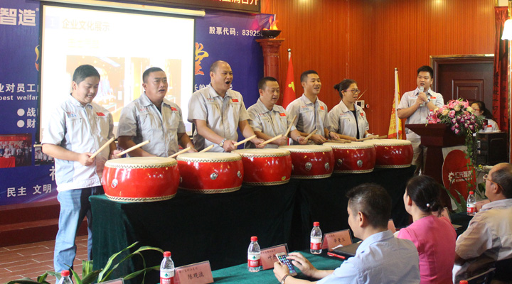 會(huì)議開始,全體員工整肅衣冠端身正意滿懷赤誠之心向企業(yè)“孝道、商道、人道”行三鞠躬禮,宣讀企業(yè)愿景——成為全球領(lǐng)先的整廠自動(dòng)化系統(tǒng)解決方案提供商,企業(yè)使命——做受尊敬的好人、造受尊敬的產(chǎn)品、辦受尊敬的企業(yè)、建受尊敬的平臺(tái),企業(yè)精神——用情做人、用心做事,團(tuán)隊(duì)精神——忠誠團(tuán)結(jié)、勤奮進(jìn)取。隨后,匯興智造高管:鐘世鑫、胡偉路、呂常垣、黃艷、廖飛、張強(qiáng),共同敲響士氣鼓、鼓舞匯興智造奮勇前進(jìn)。