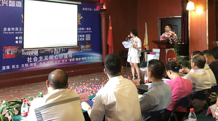 2017年9月28日,廣東匯興精工智造股份有限公司(股票代碼:839258)在匯興學(xué)校召開9月份月度大會(huì)及重要簽約儀式。董事長(zhǎng)鐘輝,辛主任,東莞證券郭副總裁一行,大信會(huì)計(jì)事務(wù)所肖所長(zhǎng)一行,華商律師所姜先生一行,中國銀行大嶺山支行葉行長(zhǎng),建設(shè)銀行大嶺山支行陳行長(zhǎng),東實(shí)集團(tuán)潘經(jīng)理等一系列特別嘉賓及匯興智造各分子公司代表參加此次大會(huì)。人資行政部經(jīng)理袁侃主持本次會(huì)議。