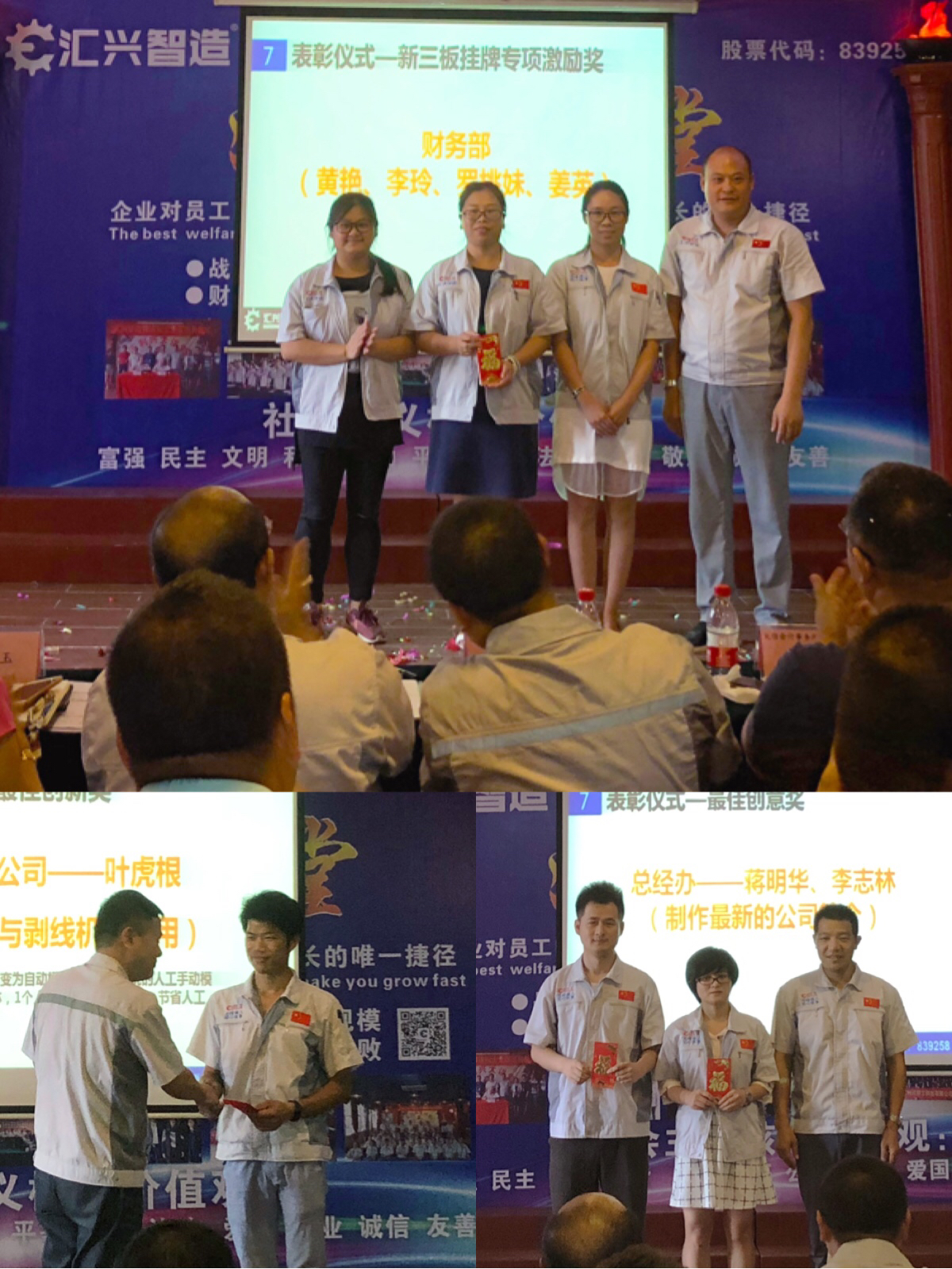 隨后舉行新員工入職歡迎儀式,每個(gè)月份都會(huì)有各個(gè)領(lǐng)域的人才加入?yún)R興智造這個(gè)大家庭,企業(yè)的快速發(fā)展需要更多的人才輸入,堅(jiān)信在匯興智造,定能營造愈加廣闊的舞臺(tái),各位新老員工在這里都能遇見最美麗的自己。同時(shí)對(duì)公司有重大貢獻(xiàn)的各位同事進(jìn)行頒獎(jiǎng)儀式,包括新三板掛牌專項(xiàng)激勵(lì)獎(jiǎng)、最佳創(chuàng)新獎(jiǎng)、好點(diǎn)子獎(jiǎng)、新聞撰寫?yīng)劇⑷瞬磐扑]獎(jiǎng)、最佳創(chuàng)意獎(jiǎng)。