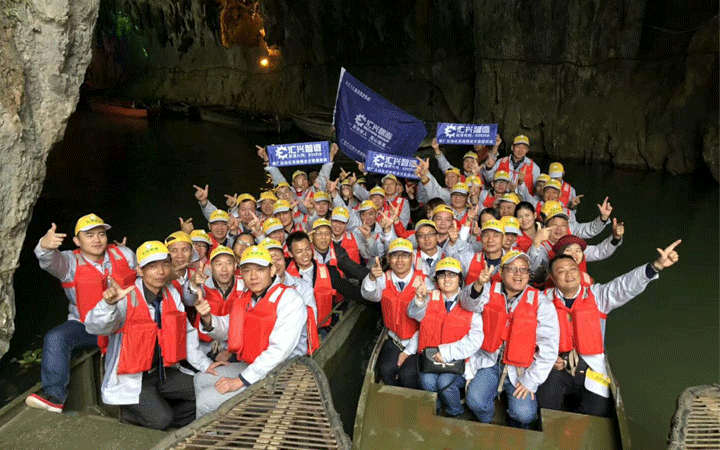 旅途第二站:仙橋地下河。仙橋地下河由兩段暗河和中間一段明河組成,自西向東,河面平靜。暗河內(nèi)鐘乳石、石灰?guī)r形態(tài)各異,有的像水母;有的像龍爪;有的像觀音;有的像關(guān)公,三分形象,七分想象,很是有趣,加上彩燈,地下河更是被妝點(diǎn)得美輪美奐。美好的事物總是能引發(fā)人類對(duì)美好未來的憧憬,“夢(mèng)想之旅”的團(tuán)隊(duì)成員們坐在船上,激情萬分地大喊:“匯興智造是我們的船,而我們?cè)诖??!蔽覀儗P(yáng)帆啟航,來一場(chǎng)創(chuàng)世之旅,去尋找那屬于匯興人的桃源之地。