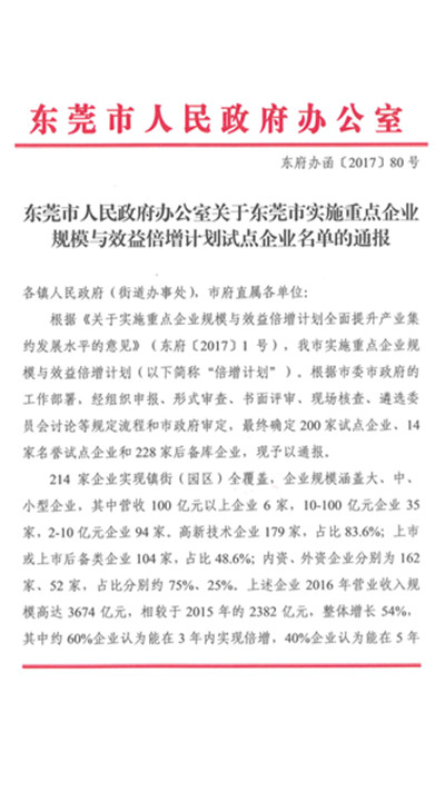根據(jù)《關(guān)于實(shí)施重點(diǎn)企業(yè)規(guī)模與效益倍增計(jì)劃 全面提升產(chǎn)業(yè)集約發(fā)展水平的意見》(東府〔2017〕1號),以及《關(guān)于東莞市實(shí)施重點(diǎn)企業(yè)規(guī)模與效益倍增計(jì)劃試點(diǎn)企業(yè)名單的通報》(東府辦函〔2017〕80號),經(jīng)過前期的書面申報、形式審查、書面評審、現(xiàn)場核查、專家評審、材料審計(jì)等規(guī)定流程和市政府審定,廣東匯興精工智造股份有限公司(股票代碼:839258)憑借17年來在智能裝備領(lǐng)域的核心科技以及高成長性,成功入選為東莞市實(shí)施重點(diǎn)企業(yè)規(guī)模與效益倍增計(jì)劃(以下簡稱“倍增計(jì)劃”)200家試點(diǎn)企業(yè)之一。