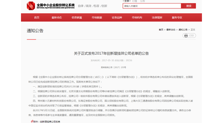 2017年創(chuàng)新層掛牌公司名單公告