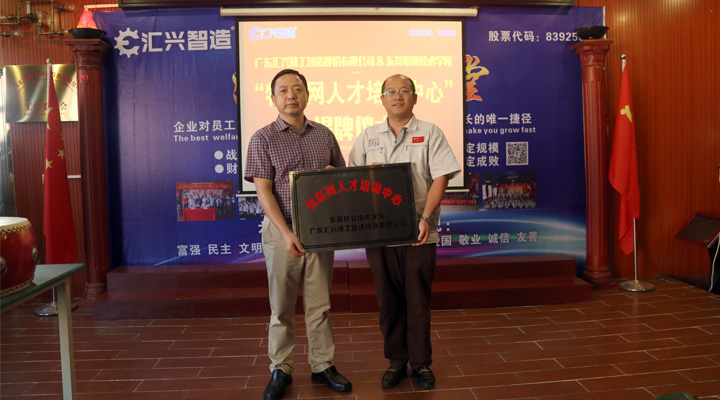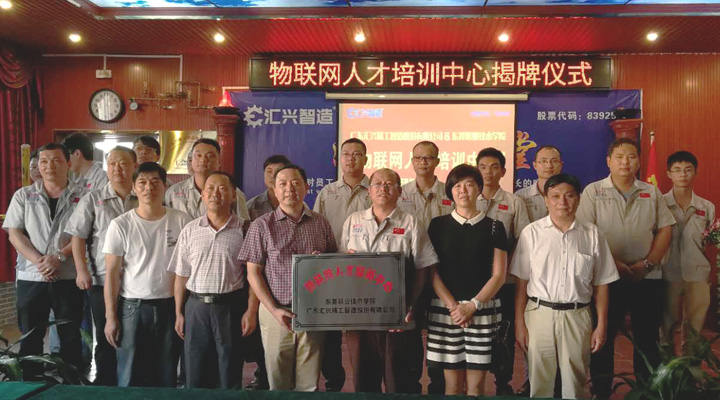 2017年9月27日下午, 東莞職業(yè)技術學院副院長楊云奇,計算機工程系主任胡選子博士,藝術設計系主任何鳳梅博士,計算機系曹文梁教授等專家人員一行蒞臨廣東匯興精工智造股份有限公司(股票代碼:839258)考察調研并舉行“物聯(lián)網人才培訓中心“基地揭牌儀式。匯興智造董事長鐘輝,匯興中德智能制造研究院院長李康順教授熱情接待了調研組一行。