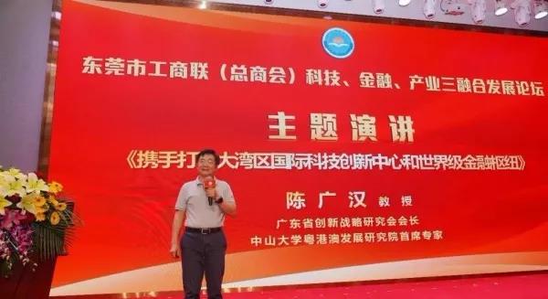 大會(huì)還邀請(qǐng)廣東省創(chuàng)新戰(zhàn)略研究會(huì)會(huì)長(zhǎng)、中山大學(xué)粵港澳發(fā)展研究院首席專(zhuān)家陳廣漢教授作了《攜手打造大灣區(qū)國(guó)際科技創(chuàng)新中心和世界級(jí)金融樞紐》主題演講。陳廣漢教授就東莞在參與粵港澳大灣區(qū)建設(shè)的過(guò)程中,在推動(dòng)科技、金融、產(chǎn)業(yè)“三融合”方面的機(jī)遇與主要努力方向進(jìn)行全方位解讀。