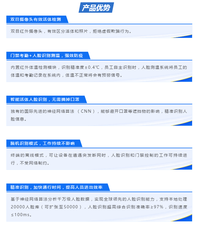 用國(guó)際先進(jìn)的神經(jīng)網(wǎng)絡(luò)算法 (CNN), 是經(jīng)數(shù)千萬(wàn)次的算法訓(xùn)練后形成的產(chǎn)品,其集圖像采集、人臉檢測(cè)、人臉跟蹤和人臉比對(duì)等功能,不僅識(shí)別率高,同時(shí)識(shí)別速度快。值得一提的是,這款設(shè)備可以輕松識(shí)別出戴口罩的人臉信息,非常適合作為此次疫情防控的有力工具。