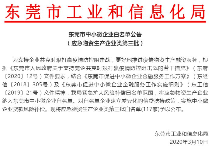 疫情防控期間,為了推動企業(yè)順利復工復產(chǎn),東莞市陸續(xù)推出系列“暖企政策”,以“組合拳”的方式幫助企業(yè)解決復工復產(chǎn)中遇到的實際問題。為全力支持和推動新冠肺炎疫情防控物資和裝備生產(chǎn)企業(yè)復工復產(chǎn)、擴大生產(chǎn),2020年2月27日,廣東省工業(yè)和信息化廳出臺了“支持新冠肺炎疫情防控物資和裝備生產(chǎn)企業(yè)擴大生產(chǎn)的獎勵政策”,支持疫情防控物資和裝備生產(chǎn)企業(yè)實施技術(shù)改造、擴大生產(chǎn),獎勵服從國家和省醫(yī)療防控物資調(diào)度要求的企業(yè)生產(chǎn)銷售。疫情防控啟動以來,為進一步用好風險補償專項資金,東莞將應(yīng)急物資生產(chǎn)企業(yè)納入白名單。目前,東莞已將兩批共145家應(yīng)急物資生產(chǎn)企業(yè)納入白名單。